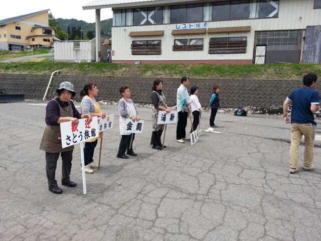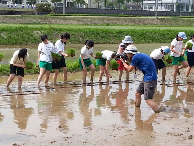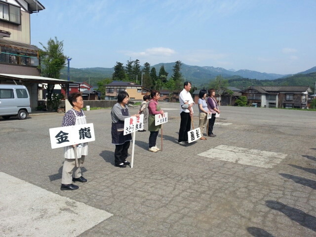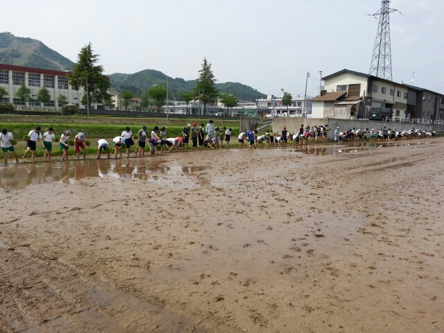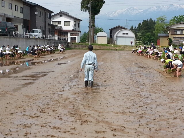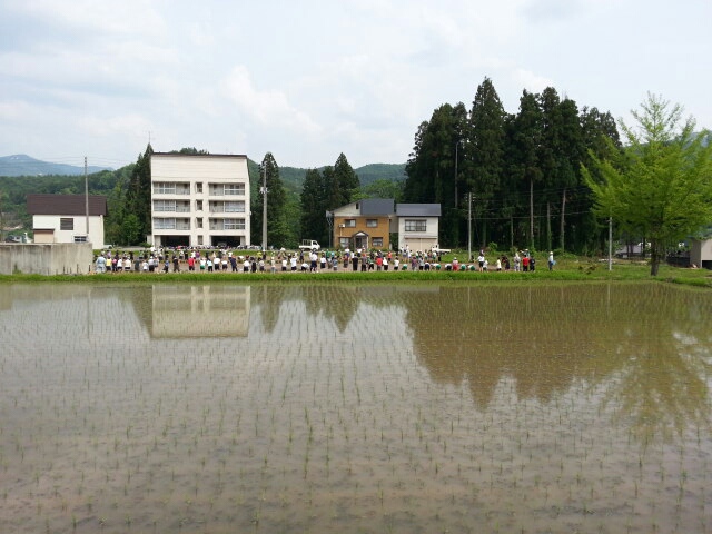 お昼に到着し、昼食後須原小学校近くで田植えです。
