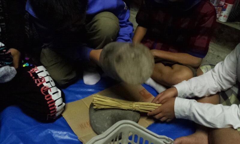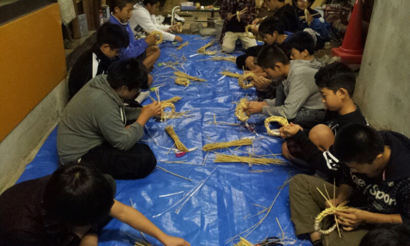 昨夜は各宿舎でわら細工、なべ敷き作りです。