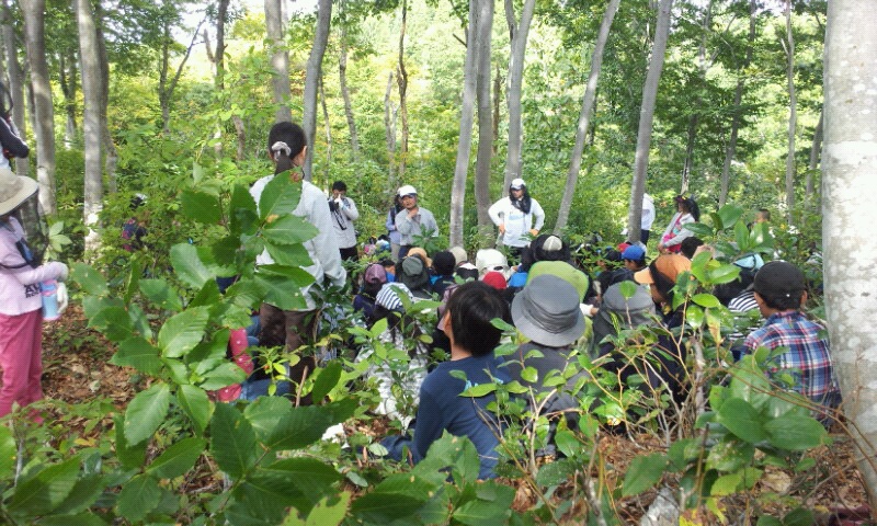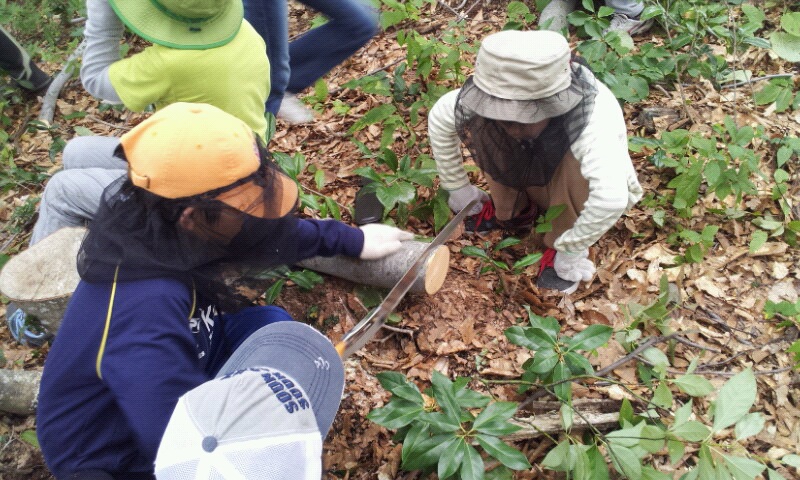 午後からは伐採体験、のこぎりで木を切っています。