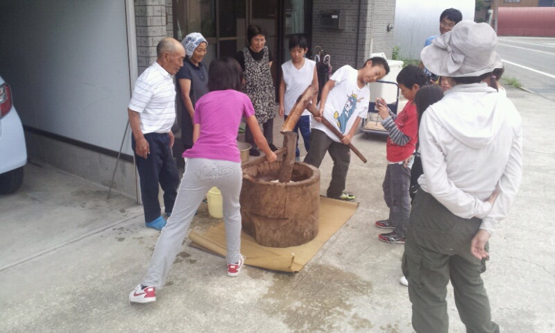 もちつき体験、お雑煮やきなこなどでお腹いっぱい食べます。