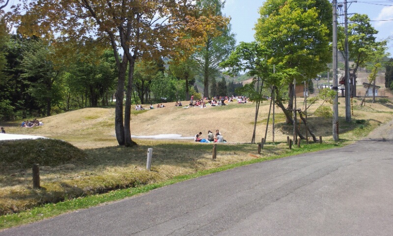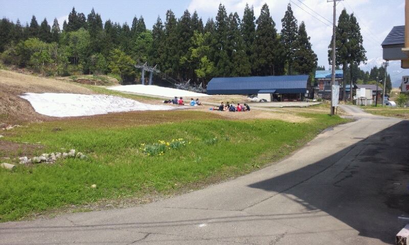 新緑のなか、雪があり、気持ち良さそうにお弁当を食べていました。