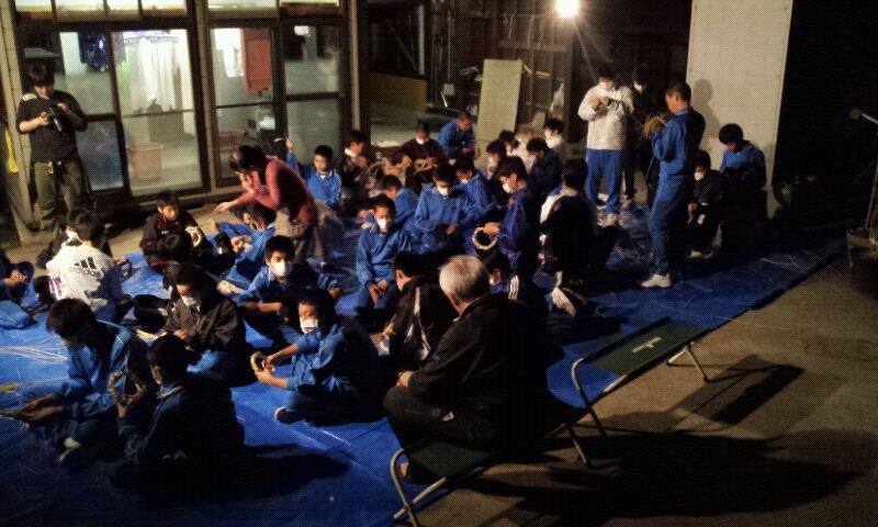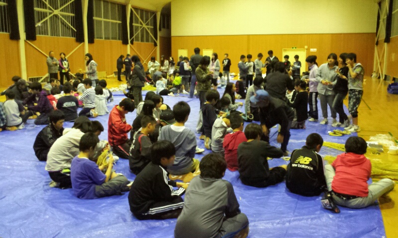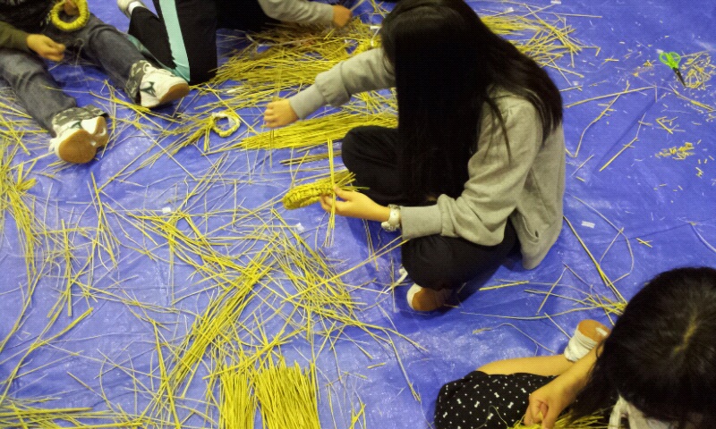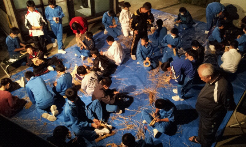 夜には体育館に集まり、わら細工、なべ敷き作りに挑戦。