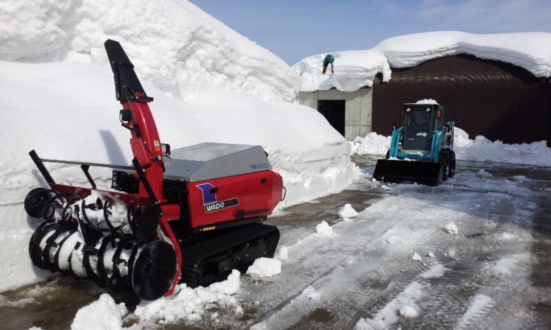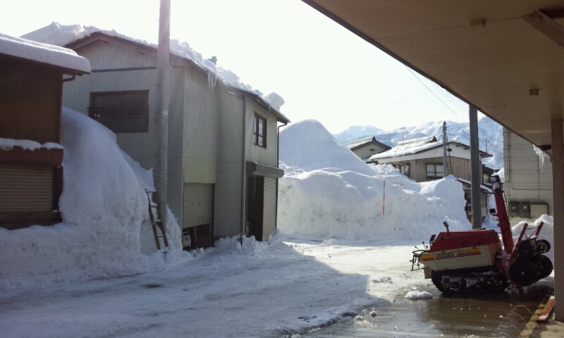 車庫の雪下ろし、おじいさんが上がって下ろしています。