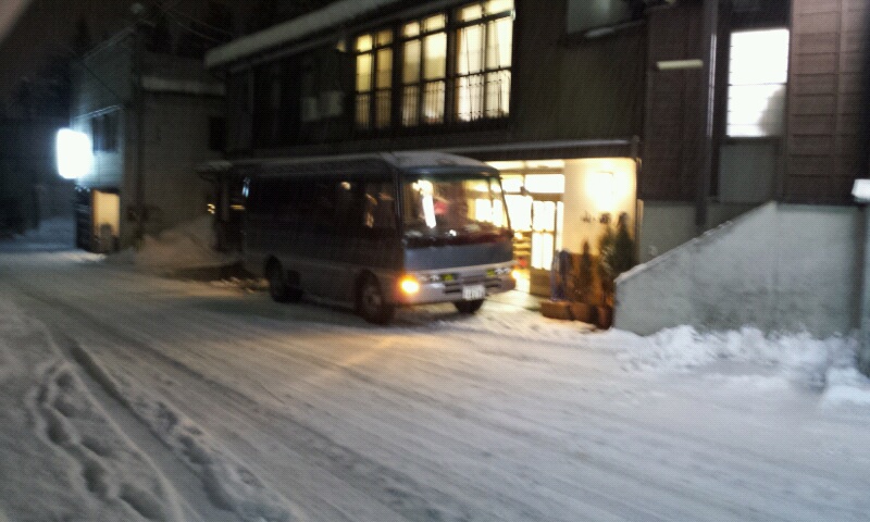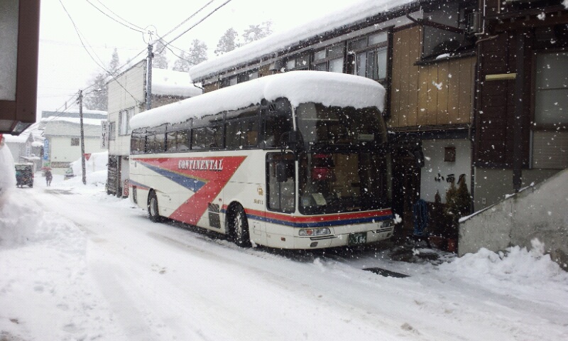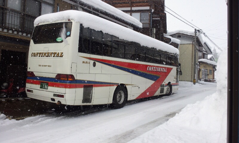 午後1時に出発、観光バスの上にはたくさんの雪が乗っています。