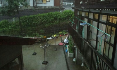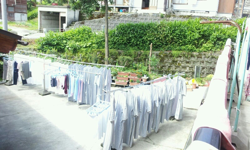 週末は宿泊客が多かったので、中庭は洗濯干しでいっぱいです。