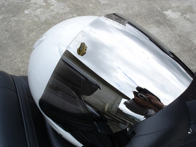 ヘルメットのシールド部分にはカエルがくっついていました。