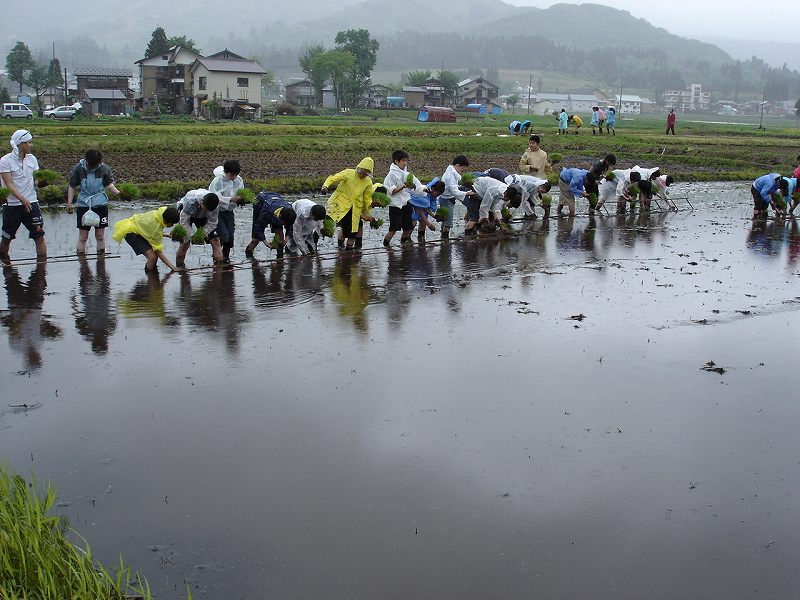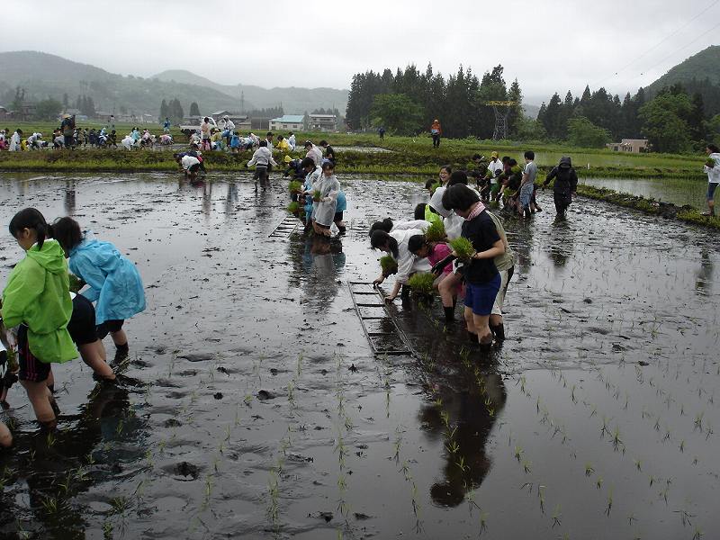 6クラス、220名、初日の田植えは雨の中での作業でしたが