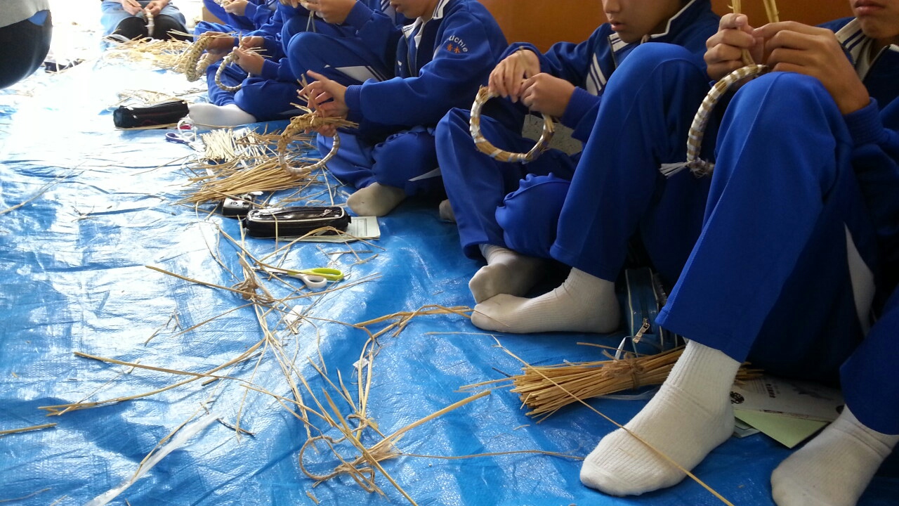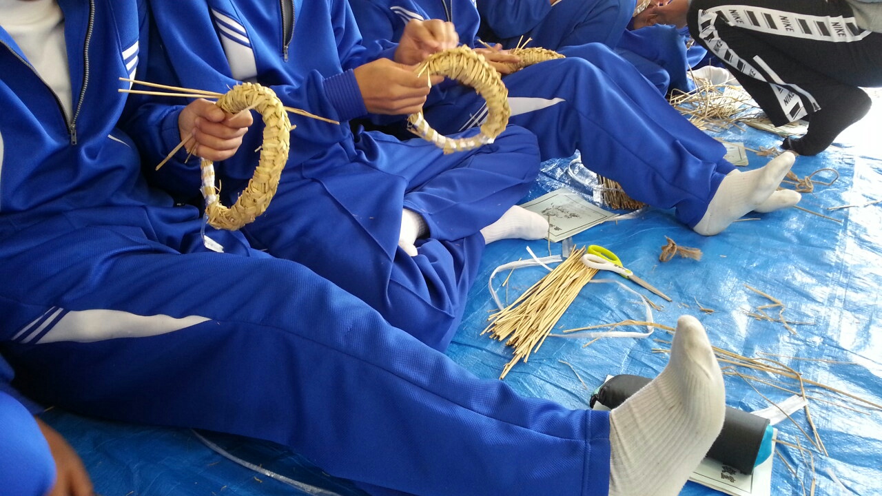 朝食後、わら細工体験、鍋敷き作り・・・・