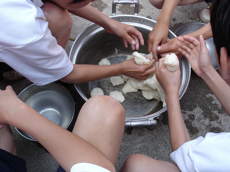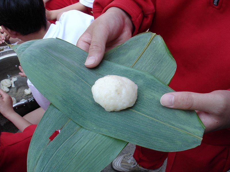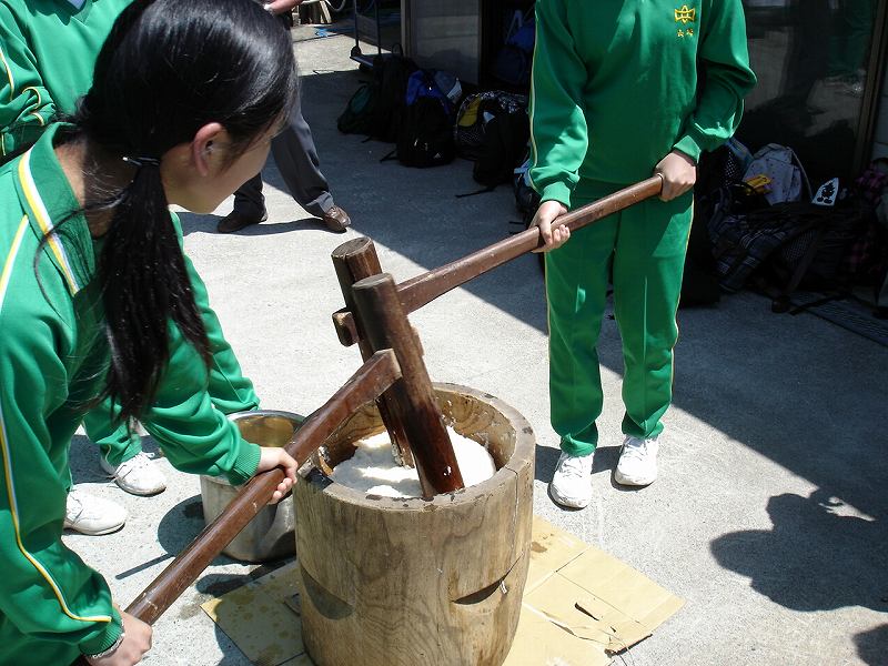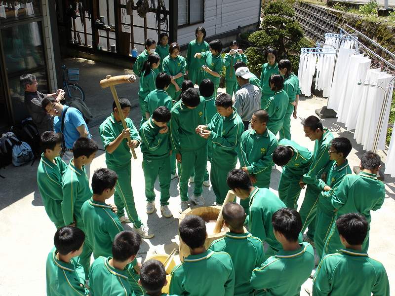 道の駅でおみやげ購入後、クラスに分かれて宿舎で昼食を兼ねたもちつき。