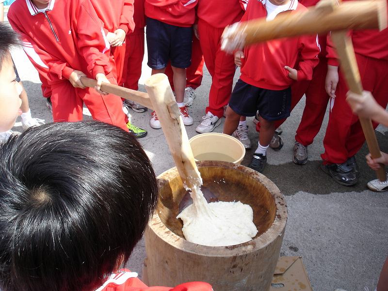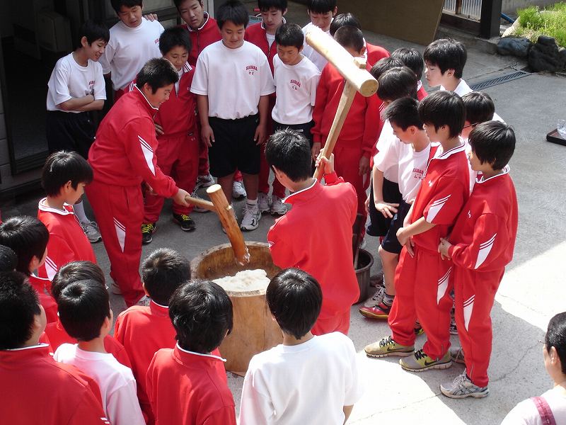 小西屋には2年1組、男子、女子に分かれてもちつきスタート。
