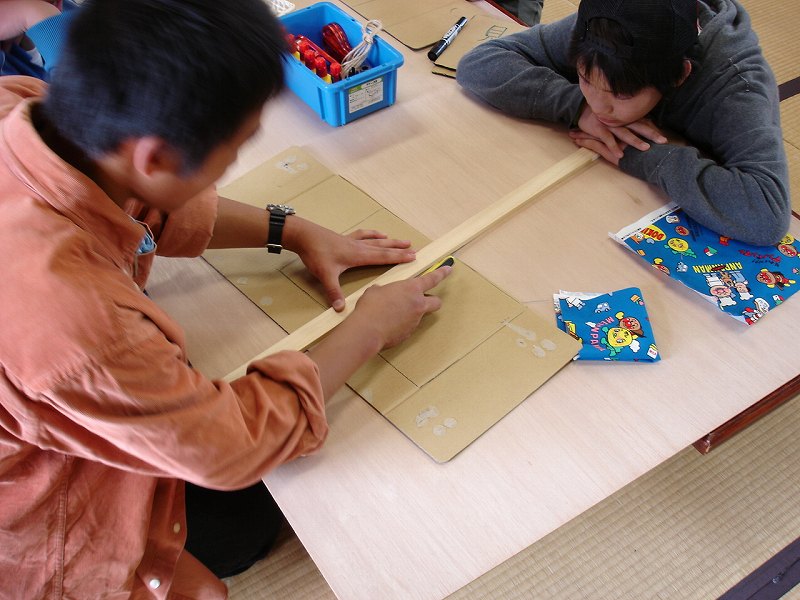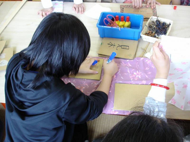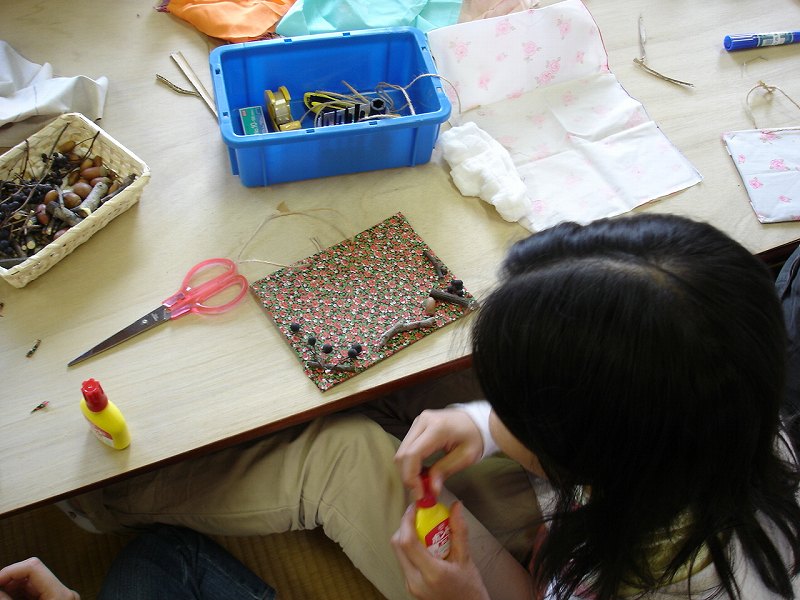 ダンボール・布のはぎれ・木の実・小枝などを使います。